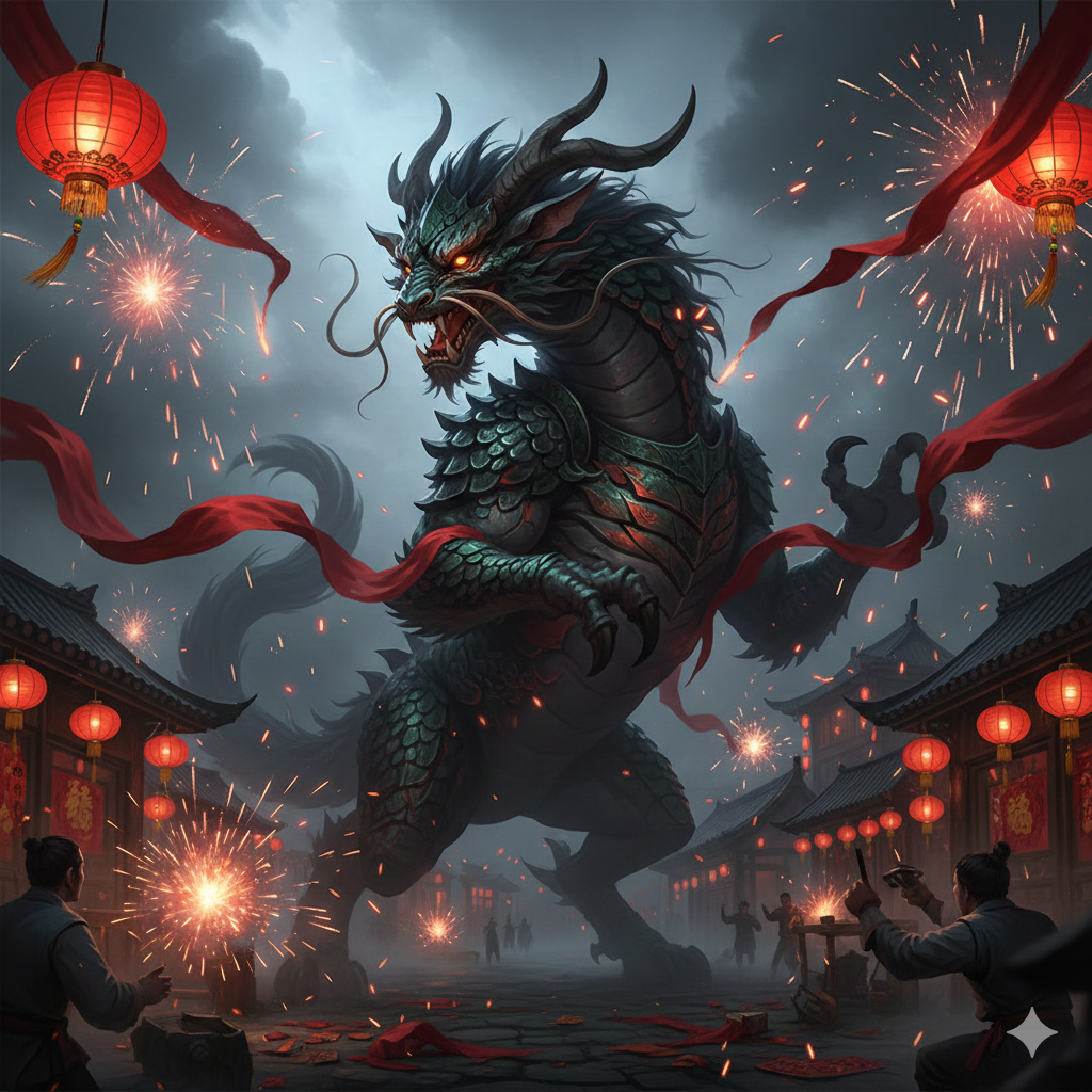 Un día una persona de edad mayor había visto que la criatura Nian tenía mucho miedo a los ruidos fuertes, a las llamas de fuego, linternas rojas, pergaminos rojos en puertas, ventanas y sobre todo al color rojo como tipo seda y se enfrentó a la criatura una vez pasado el evento los habitantes del pueblo regresaron de las colinas circundantes y vieron que no hubo destrucción alguna para evitar que cause destrucción por su paso las personas comenzaron a poner cosas de color rojo así como los pergaminos y bastones de bambú y petardo junto un poco comida a fuera de sus casas como señal de que los dejaran en paz y se fuera esto se repetiría año tras año.